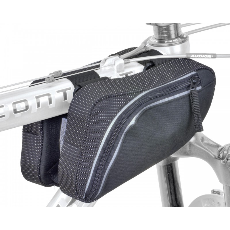 Dvojitá brašna na přední část rámu, univerzální uchycení pro většinu typů rámů, 2 samostatné polstrované kapsy (2× 0,6 l). Rozměr jedné brašny d. 23 × š. 4 × v. 12 cm.