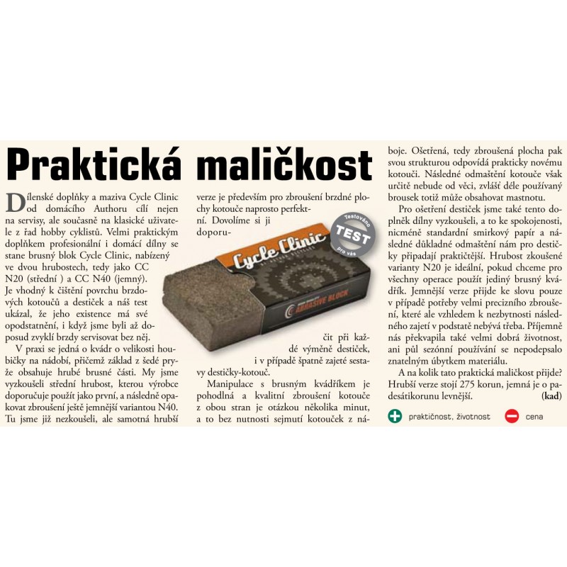 Brusný blok Cycle Clinic je elastické brusivo určené pro čištění povrchu brzdných ploch ráfků a brzdových kotoučů. Vyčištěním brzdných ploch zvýšíte brzdný výkon. Blok může být použit na suchém nebo mokrém povrchu, nebo s mýdlovou vodou. Doporučujeme požít nejprve hrubší CC N20 pro základní čištění a jemný CC N40 pro konečnou úpravu.