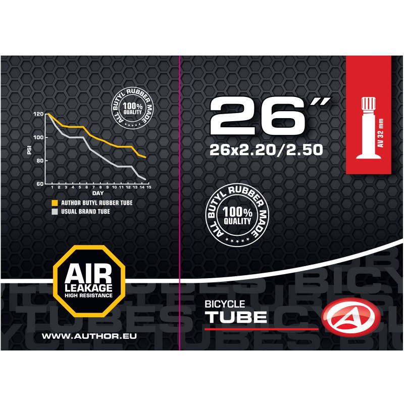 Duše AUTHOR 26x2.20-2.50 vyrobená ze 100% butylové pryže s velmi nízkou propustností pro plyny. Udrží tlak vzduchu v pneumatice jízdního kola po delší dobu, než duše vyrobené ze syntetické pryže.