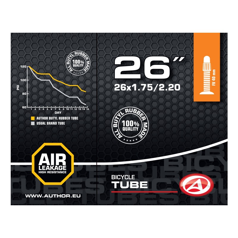 Duše AUTHOR 26x1.75-2.20 vyrobená ze 100% butylové pryže s velmi nízkou propustností pro plyny. Udrží tlak vzduchu v pneumatice jízdního kola po delší dobu, než duše vyrobené ze syntetické pryže.