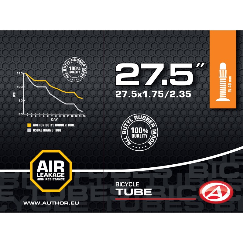 Duše AUTHOR 27,5x1.75-2.35 vyrobená ze 100% butylové pryže s velmi nízkou propustností pro plyny. Udrží tlak vzduchu v pneumatice jízdního kola po delší dobu, než duše vyrobené ze syntetické pryže. Galuskový ventil 40 mm. Nízká propustnost = delší čas bez huštění. 100% kvalita, každá AUTHOR duše je ve výrobě tlakově odzkoušena. ETRTO 47/60-584.Příjemce :