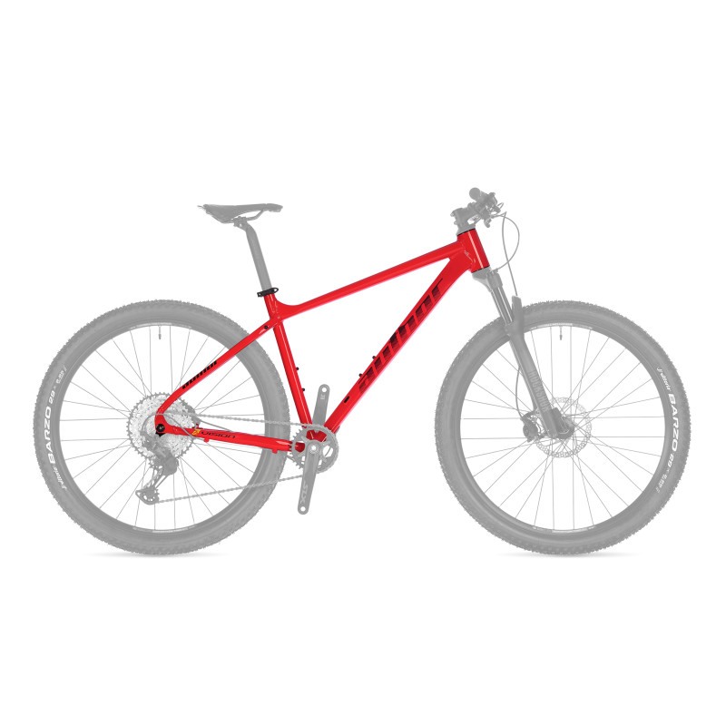 Hydroformně tvarovaný rám z 3× zeslabované slitiny hliníku 6061, středová spojka standardu Shimano BSA, sedlová trubka vrtaná pro sedlovku 31,6 mm, UDH koncovka rámu, hlavové složení FSA NO. 69 / 62 / SRS / Center / CUP; FICR, PF; 1.5" Press Fit Integr. včetně duralového víčka, 5×5 mm AL podložka, 6 závit. bodů na rámu, barva červená lesklá. Nabízené velikosti: 17", 19" a 21".