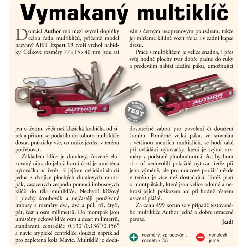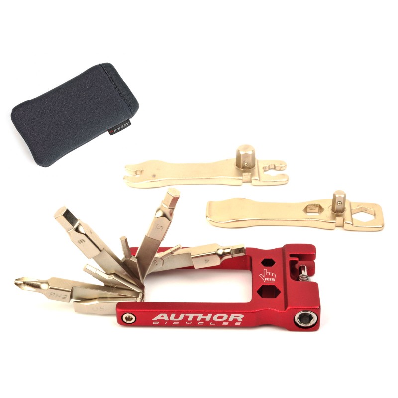 Nářadí AUTHOR Expert 19 Inbusy: 2 / 2.5 / 3 / 4 / 5 / 6 / 8 mm. Šroubováky: Phillips PH1 / SL5. Stranové klíče: 8 / 10 mm. Centrovací klíče: 0.130"/0.136"/0.156" a 2. Nýtovač řetězu. Montážní páka 2x. Neoprenová kapsa. Materiál: Cr-V tvrzená ocel. CNC duralové tělo. Velikost (složené): l.77 mm x š.40 mm x h.15 mm. Hmotnost: 124 g.Příjemce :