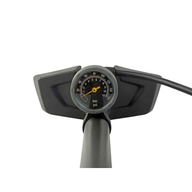 Nožní hustilka AUTHOR AirTurbo Eco s ocelovým válcem umístěným na velmi stabilní kompozitní základně s extra velkými opěrkami pro nohy. Velký, snadno čitelný manometr umožňuje přesné měření tlaku, ať už doma, v dílně nebo na trailech.