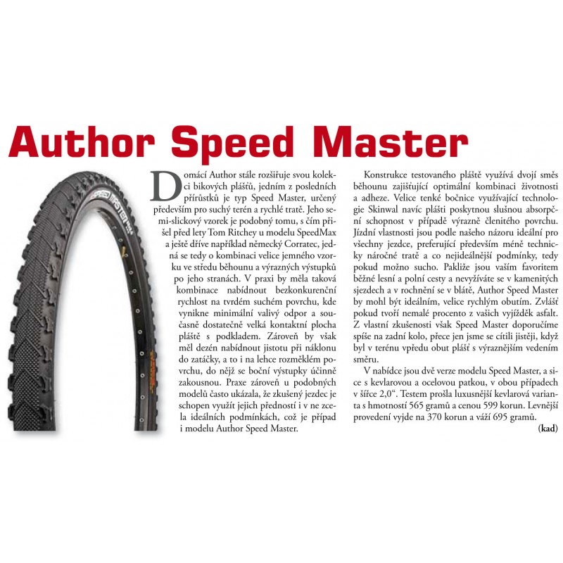 Plášť AUTHOR SPEEDMASTER je všestranný, rychlý a robustní. Středový dezén s nízkými výstupky tvaru jehlanu zaručuje nízký valivý odpor a poskytuje vynikající přilnavost na tvrdém povrchu. Hrubé boční výstupky dodají vašemu kolu stabilitu v terénu. 27 TPI, Technologie Dual Compound – Skinwall. Standardní provedení - patka ocelový drát. Doporučený tlak huštPříjemce :