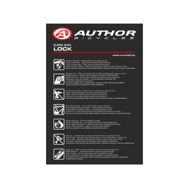 AUTHOR FlexGuard-6 je nový typ skládacího zámku v kompaktním lehkém provedení. Ocelové profily (tl. 3,5mm) potažené měkčeným plastem zabraňují poškození jízdního kola. 6 článková konstrukce zaručuje snadné a rychlé složení/rozložení. Pro zvýšení odolnosti proti destruktivním metodám překonání jsou komponenty zámku vyrobeny ze speciální tvrzené oceli.Příjemce :