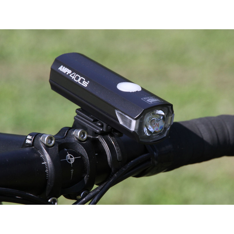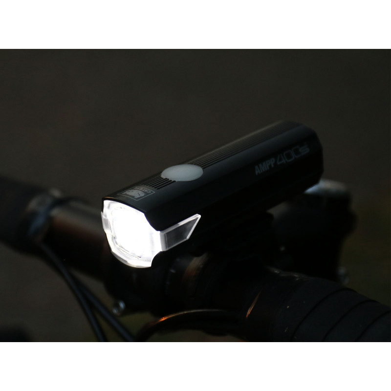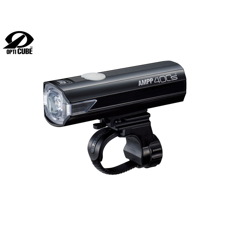 Přední dobíjecí výkonné (400lm) světlo CATEYE AMPP400S s technologií OptiCube (speciální konstrukce optických čoček usměrňující tok světla pro lepší osvícení vozovky). Indikátor kapacity akumulátoru a dobíjení integrovaný do vypínače. Hmotnost s držákem 120 g.