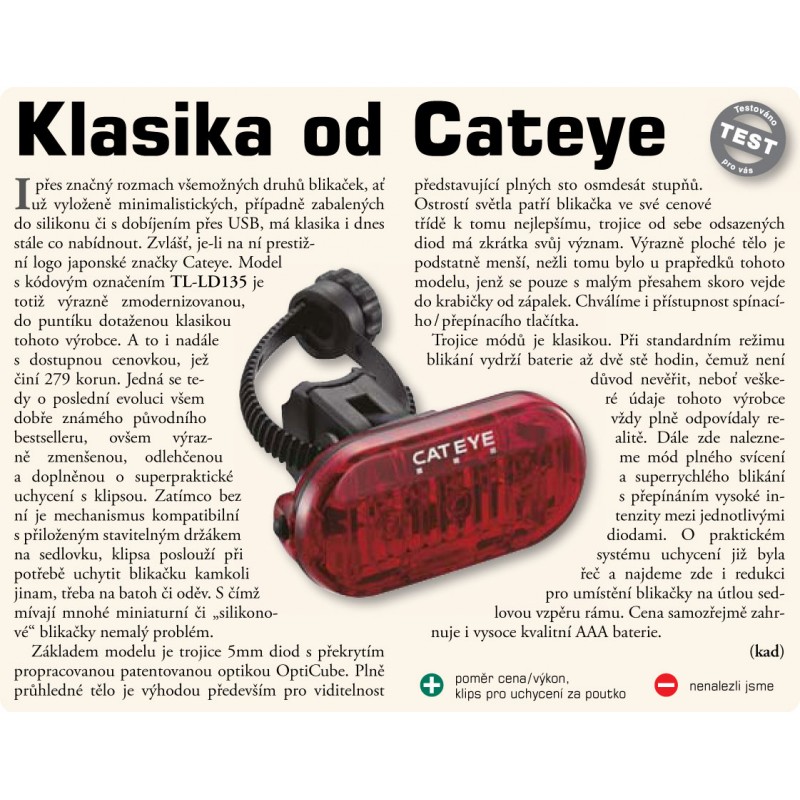 Zadní světlo - blikačka CATEYE s držákem na sedlovku Flex-Tight (o13-32mm) + klip na brašnu / oblečení. 3 červené LED s OptiCube technologií zvýšující výkon diod. Průhledné tělo pro viditelnost ze všech stran. 3 režimy svícení (konstantní a 2x blikání). Doba svícení: až 100h - konstantní svícení, až 200h - blikačka. Zdroj 2xLR-03 (AAA) alkalické baterie - jsou pPříjemce :